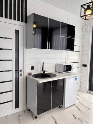 Коттеджи в 2 этажа на первом разместили гостиную с камином, оборудованную кухню. Кухонная зона имеет все необходимое: технику, посуду, плиту для самостоятельного приготовления еды.