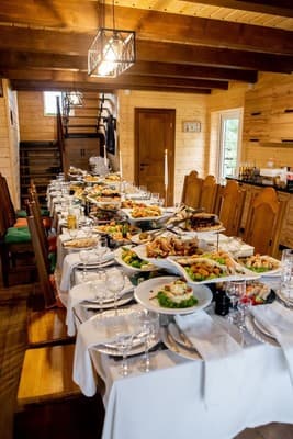 В каждом коттедже Мигово есть кухонная зона, оснащенная всей необходимой бытовой техникой, столовыми принадлежностями и посудой. Люди, не желающие готовить еду самостоятельно, часто заказывают, за дополнительную плату, двухразовое или трехразовое питание у хозяев.
