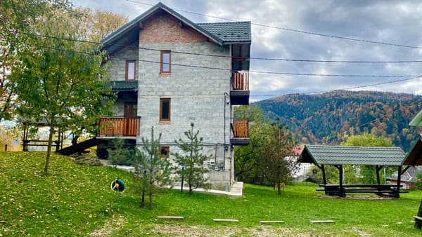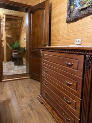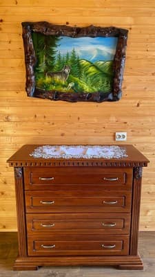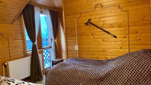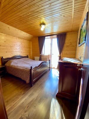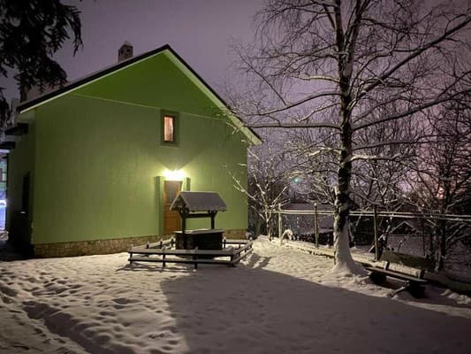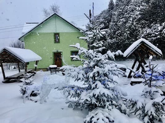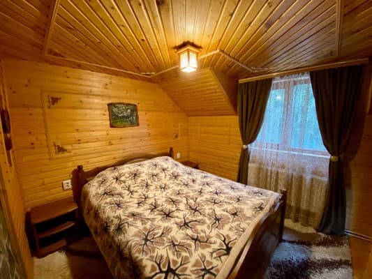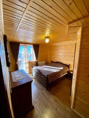 В карпатском поселке Микулин, находится частная усадьба “Горянка”. Большой коттедж насчитывает 7 уютных номеров с деревянной отделкой, что размещены на 2-х этажах и могут вместить до 14 отдыхающих. Первый этаж имеет полноценную кухню с нужной техникой, посудой, кухонной мебелью и телевизором, три спальни с большими кроватями, спутниковым ТВ, шкафами, раскладными креслами в двух из них. Второй этаж занимает гостиная с телевизором и обеденным столом, две спальни, оборудованные, как на первом этаже и две спальни, что дополнены балконами. На каждом этаже расположено по две ванные комнаты, выполненные в современном стиле. По всей усадьбе доступен свободный WiFi. У гостей есть возможность отдыхать на летней террасе, готовить на мангале. Дополнительно гостям доступны: услуги прачечной, вызов такси, организация экскурсий, прогулок на лошадях, походов в лес и горы, бесплатная парковка. Недалеко находится магазин, кафе, хорошая сауна и пункт проката лыжного снаряжения. Расстояние до центра Микуличина-1 км, до ж/д станции-3 км, до подъемников ТК Буковель-20 км.