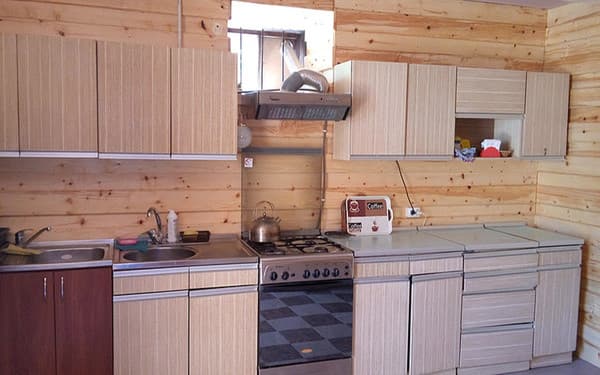 В некоторых усадьбах представленная кухонная мебель ручной работы из дерева.